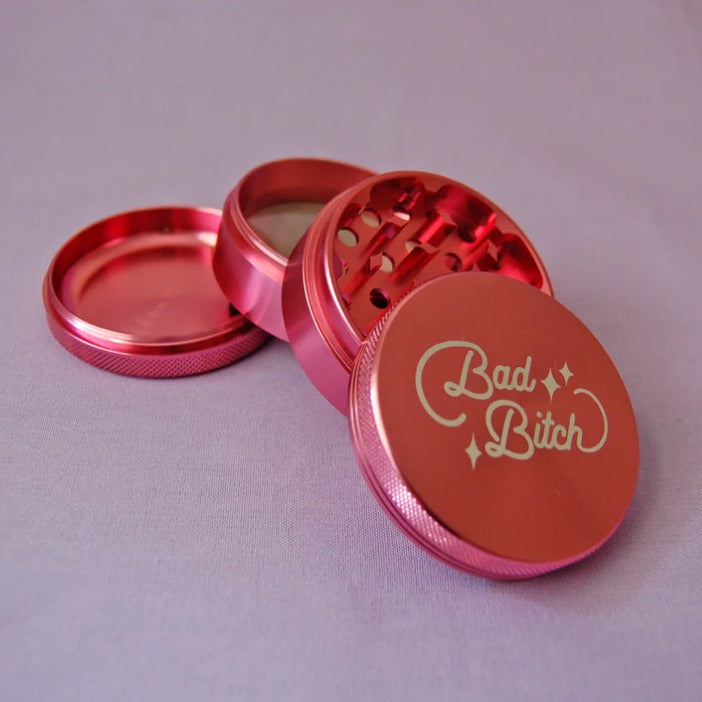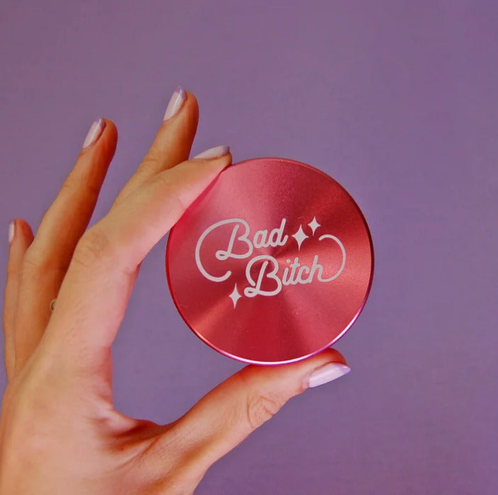 This metallic pink grinder is engraved with words “Bad Bitch” and features 4 parts with 3 compartments including a magnetic closure on the lid.