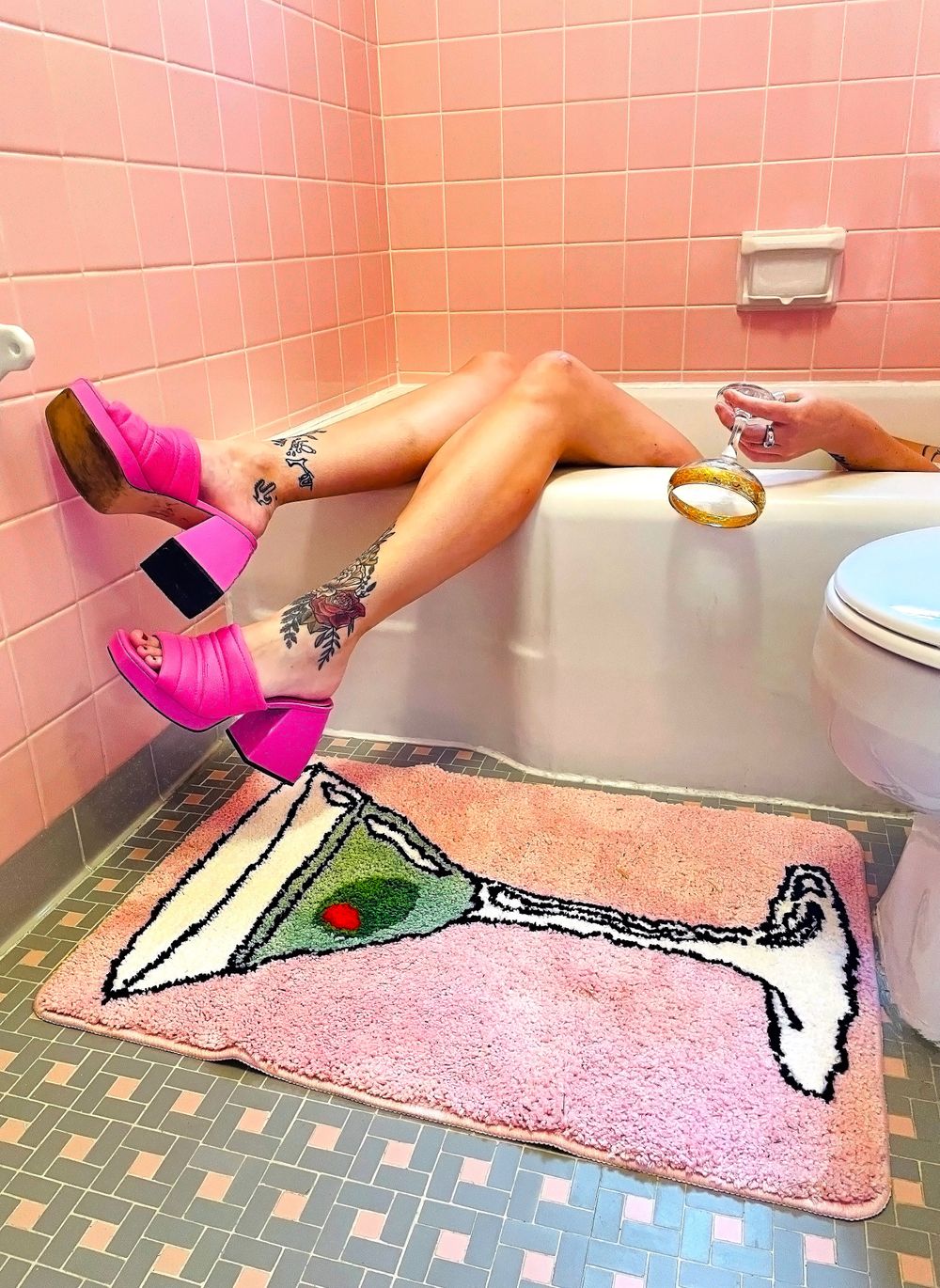 Measures 76cm x 51cm. The design is a pink rectangle rug with a martini, complete with an olive! Slip resistant backing, so no need to get rug tape! Made from 100% polyester, can be machine washed, but we recommend hand washing. Do not iron, air dry only.