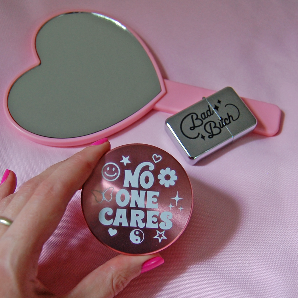 This light pink grinder says NO ONE CARES on the top lid and features 4 parts with 3 compartments. The top has a magnetic closure so you can infinitely grind it and the top stays on.