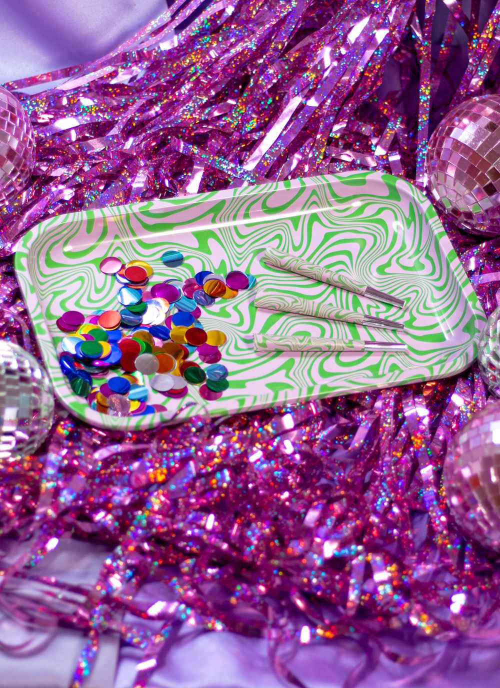 Covered in a trippy swirl, this tray is perf for rolling or as a lil trinket tray around your home.