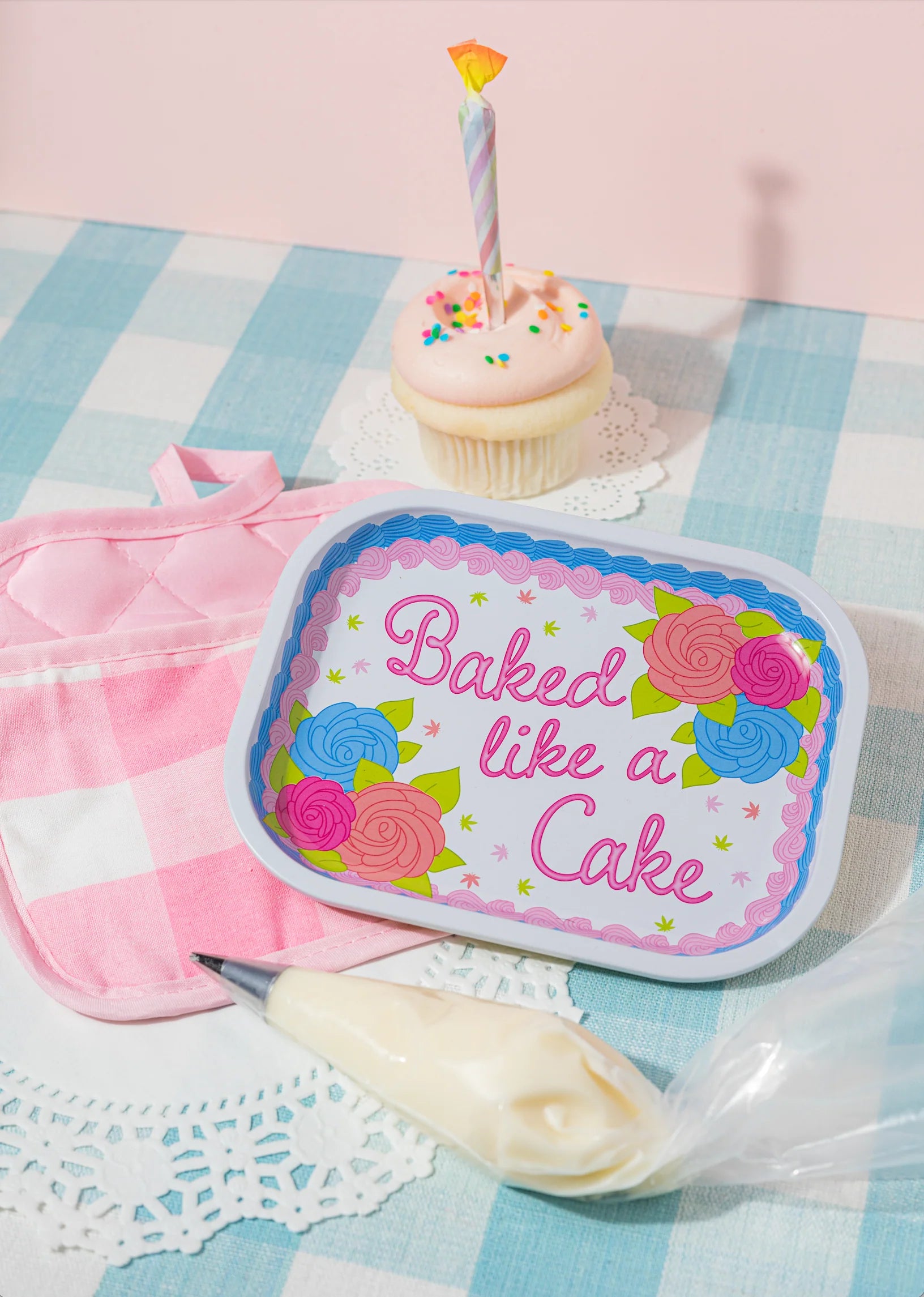 - This tray features a realistic cake artwork, with a kitschy nod to getting high