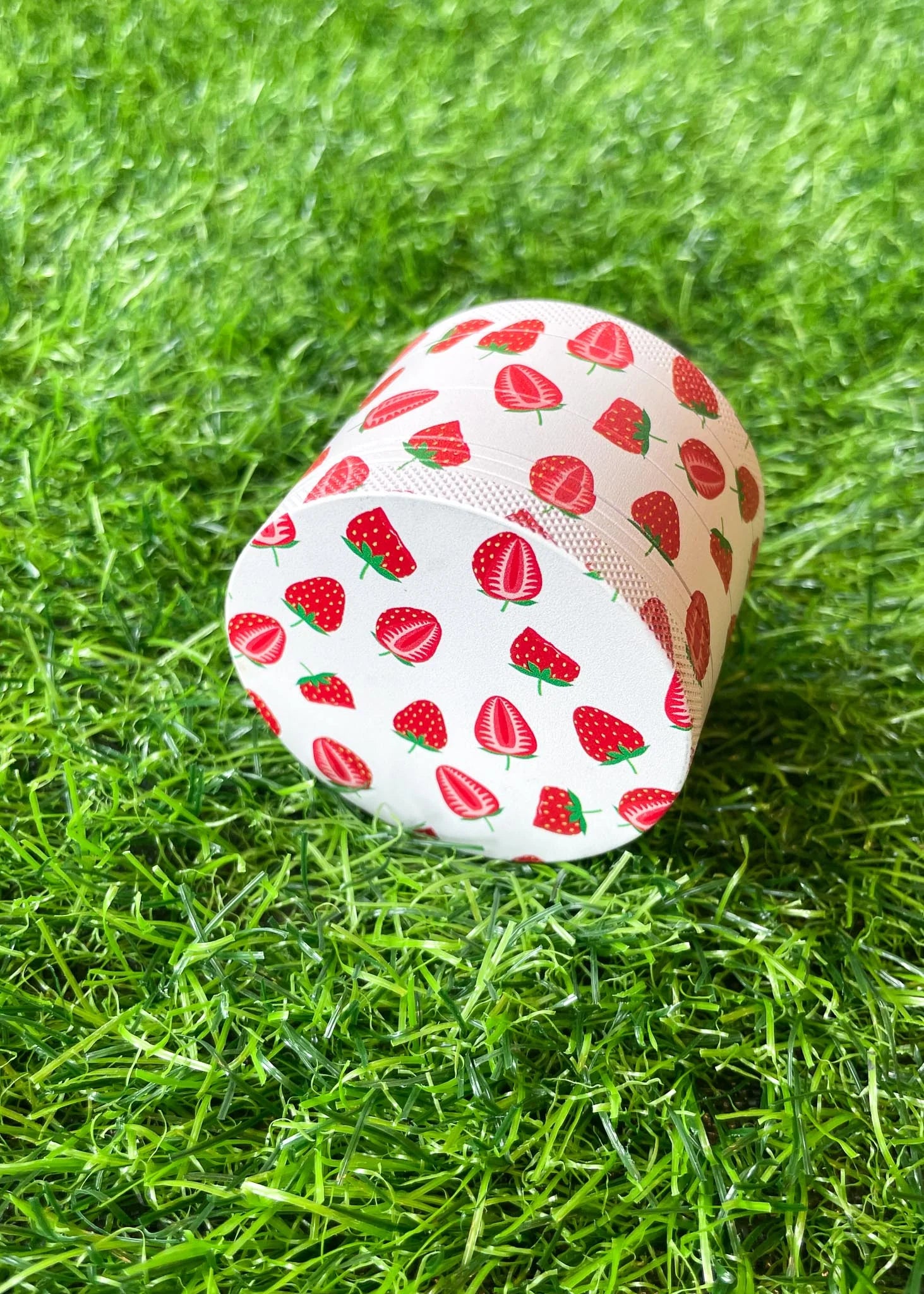 - A cute strawberry pattern adorns the outside of this grinder. A pretty pink color awaits on the inside
